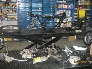 Thanks for the reply. This bike was built completely with lightness being the key issue. I made the frame completely form scratch using thin wall tubing. The back cowl was hand formed. The forks are inverted dirt bike forks but I had to make new triple clamps and clip on handle bars to fit the wider front tire an also the fender mounts.