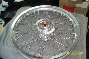 front wheel totally assembled with the tire is a hint under 11lbs. The rear a little heavier, due to the heavier dutyu dirt bike hub with the sprocket and heavier disc brake. Running friction was also a consideration.The front disc brake is an Avid BB7 which is a ball bearing mechanical mountain bike brake, which totally releases the front disc when not braking. Since my rear swingaem pivot point is further back than normal and you get into the distance between the motor sprocket and the rear sprocket changing as the swing arm pivots, I needed a different type of chain tensioner. There is a ball bearing idler sprocket mounted to the swingarm and as the distance between the 2 sprockets becomes smaller due to rear suspension compression the idler sprocket deflects the chain and keeps the chain tension constant at all points of the suspension