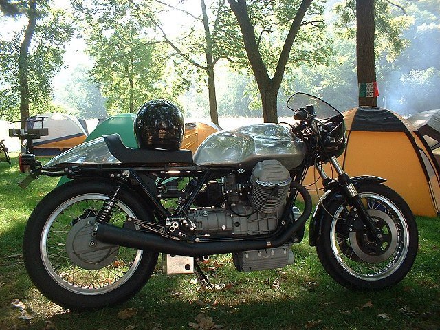 Alloy Tank Guzzi on a camping trip.
