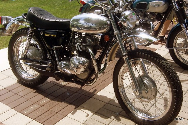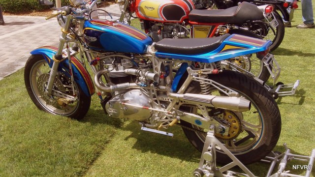 A rare T120RV, a 5 speed Bonneville from 1971 with matching engine and frame numbers. The T120RV was released in the US in 1972, to permit Triumph to use them in American Motorcycle Association production-based racing. But a few were imported in late model year 1971. In order to race, all bikes had to be made and sold to the public in the same basic form as they would be raced. To meet this requirement Triumph had to produce and sell 200 of them before they qualified.