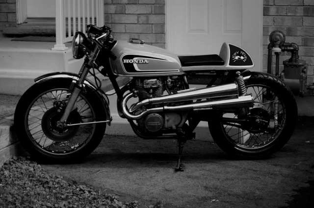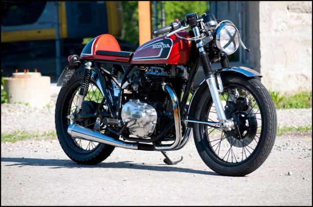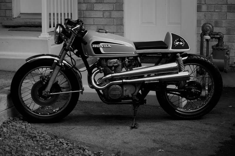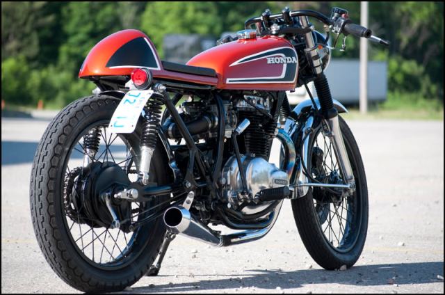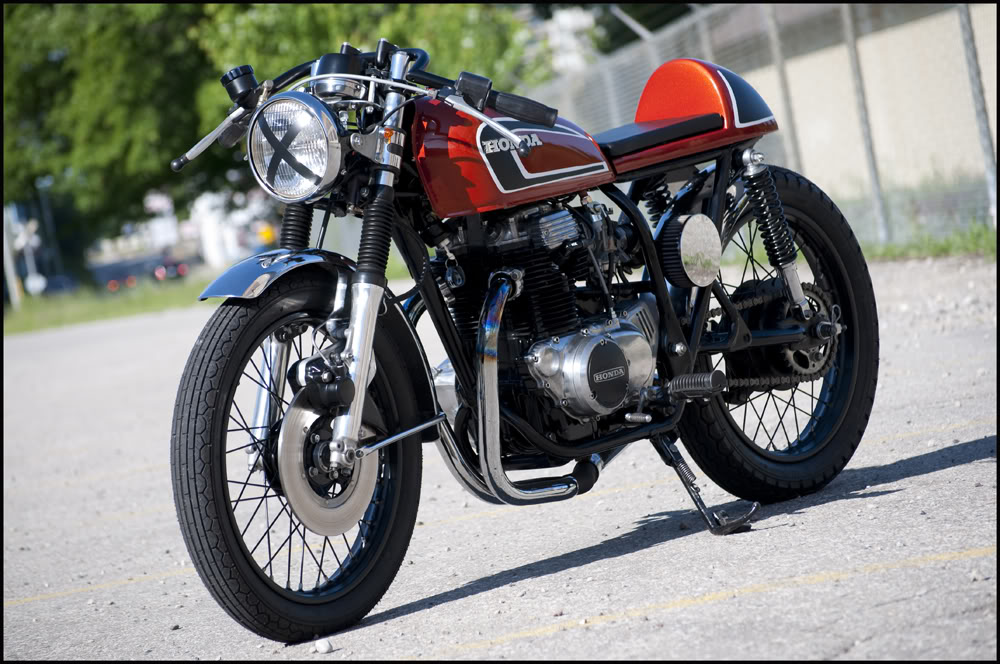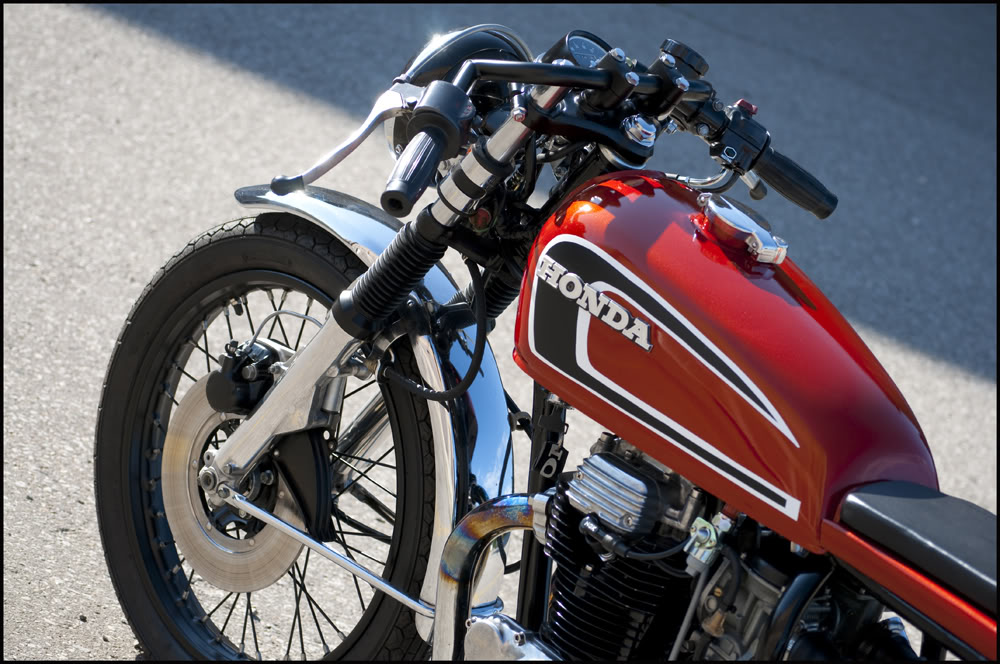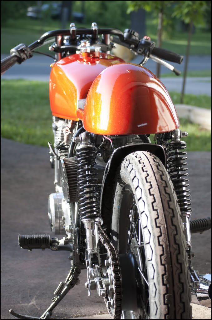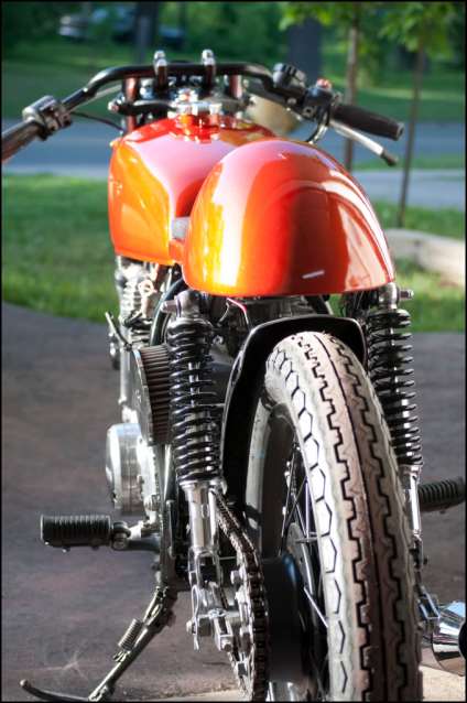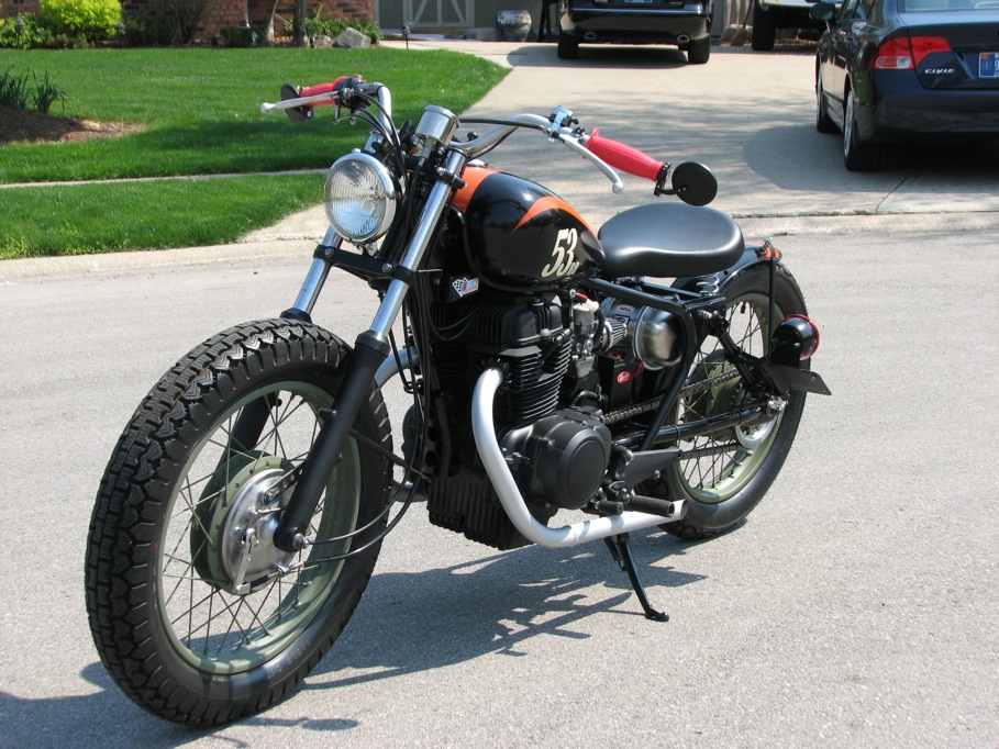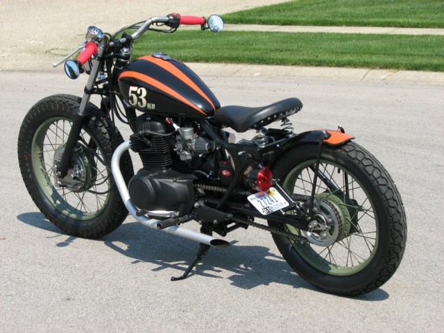 Here are a couple of pics of a 78′ Honda Hawk 400t the we did over the winter. It was a throw away we retrieved and started chopping. It’s low budget but cam out pretty good. The swing arm has be extended 4″ to get a little more wheelbase. The front old Goodyear DT dirt track tire was the start of the inspiration to head to the dirt track look. Tank is a 88 Yamaha Virago 250, license plate bracket is two 5hp Briggs connecting rods. Handle bars awe from a Yamaha ATV. Rides great and has good handling manners. Cheap fun!