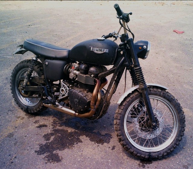 Thanks to our official MPOTD roving reporter Mike Skelton for the find. I love that this pic shows that the bike is ridden for it’s intended purpose and not just a show queen. I bet it”s a decent handler to boot. Hey Triumph how about a stripped down version for the general public! I imagine it’s be a bit more practical with the sidepipe but I still like the dualies.