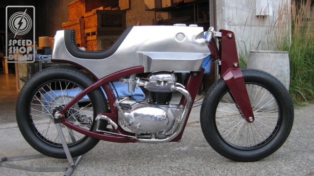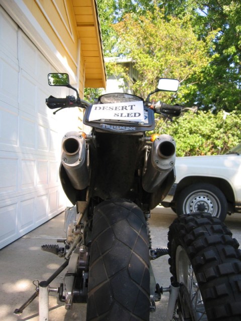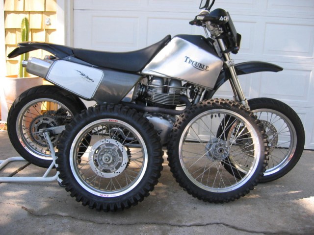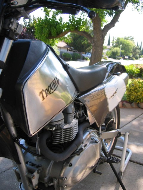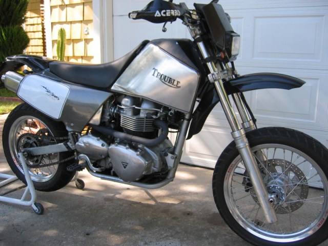 What it is: 2002 Triumph Bonneville motor with 2 35mm Mikuni Flat Side Pumper carbs, 4130 Cromemoly TIG welded frame with 46mm KX500 Forks (10.7″ travel), Rear single shock CR500 (10.8″ travel). Hand made Aluminum 5+ Gallon tank. & Side panels, Two sets of wheels, street & Dirt on Excell rims (have their own sprockets & rotors), Scotts Steering Stabilser, ICO Speedo, hand made High pipes with Jardine mufflers. Renthal Bars.