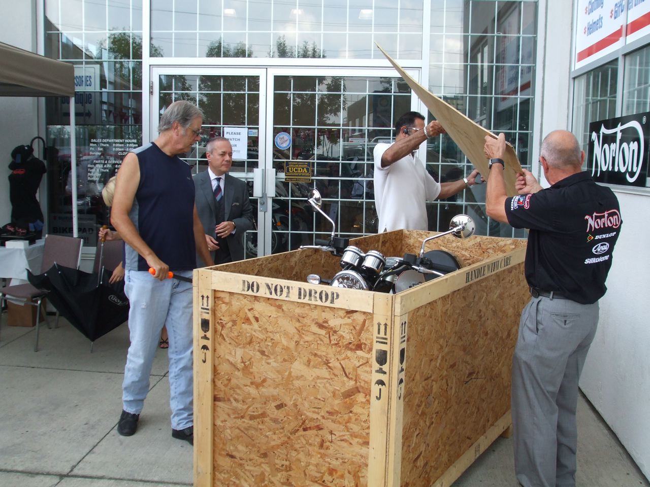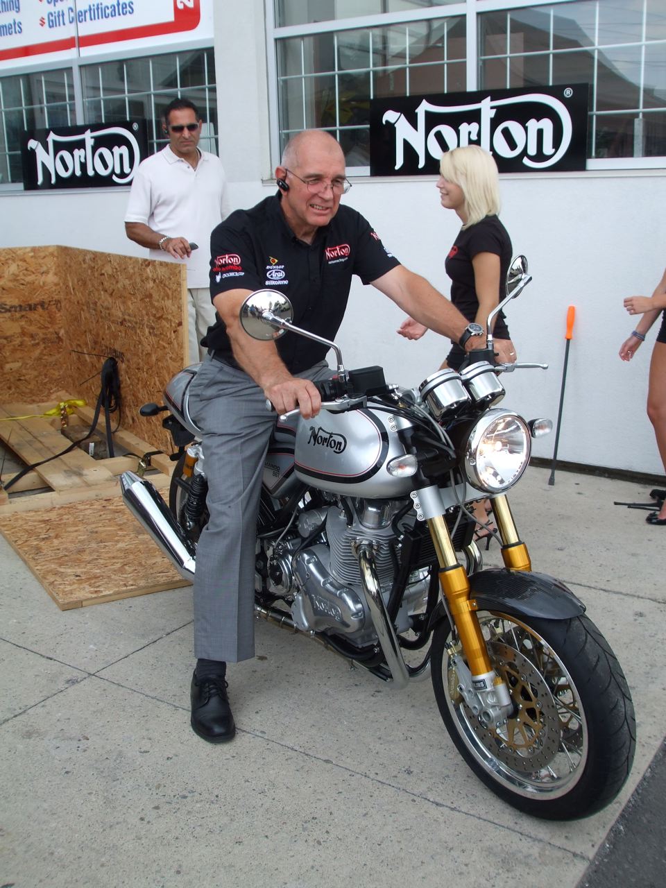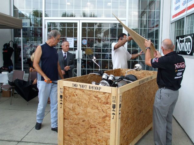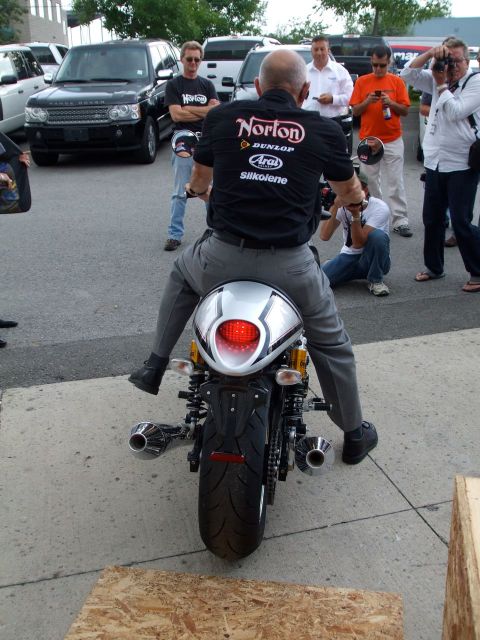 Thought you and your viewers might be interested in these shots of the first new Norton Commando to hit North American shores since 1976. 2010 Commando 961 Sport. I was at the Unveiling Event in Newmarket, Ontario (Toronto) on August 11th. Came out of the crate, fired up and driven around the block by President of Norton Canada Peter Howes (in the black Norton shirt). Looks and sounds like a Norton – 2010 style. As an old Norton aficionado I can’t wait to ride one and see what it feels like. Production bikes (limited quantity, basically small scale hand made) will arrive in Canada www.nortoncanada.ca and the U.S. (U.S. Distributor is Matt Capri in Long Beach, CA www.southbaynorton.com) by next Spring. 3 Commando models – Sport, Café Racer and SE. U.S. More info at www.nortonmotorcycles.com