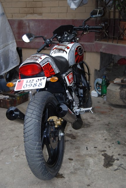 Hello, My Names is Te-a, I’m from the far north east corner of India, in the city of Aizawl, Mizoram. We are a huge fan of your blog, keep it up. Heres a couple of pictures of a custom RD350, done by my brother Muansanga MSX. The frame is stock, rear suspension is from a 150cc 4-stroke Yamaha R15, tail cowling fabricated, wheels are 17-inchers from R15, 120/80 rear tire with a 100/80 front. Engine is completely rebuilt from scratch, with a stage 1 porting job with a custom built MSX expansion chamber. Custom painted by yours trully. Hope you like it. Thanks.