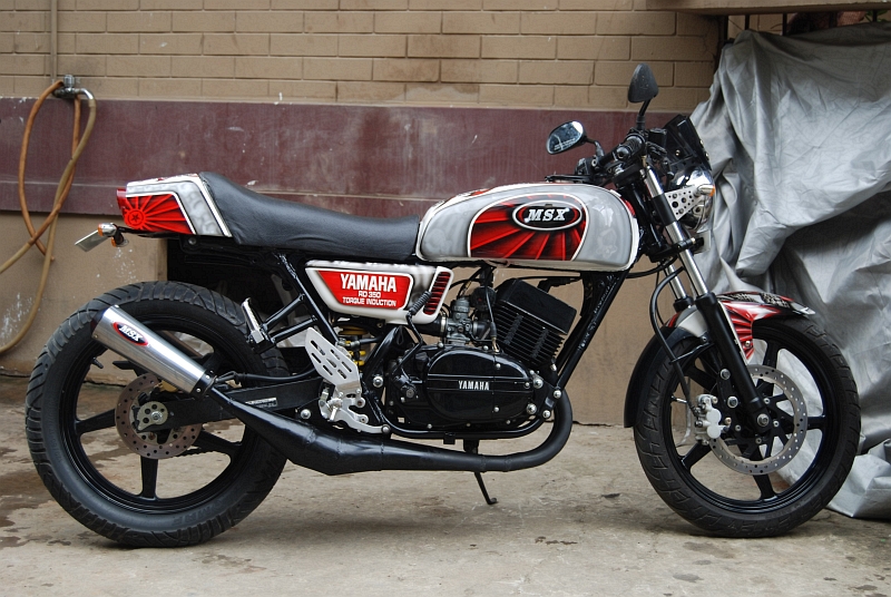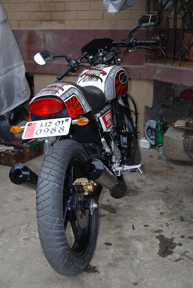 Hello, My Names is Te-a, I’m from the far north east corner of India, in the city of Aizawl, Mizoram. We are a huge fan of your blog, keep it up. Heres a couple of pictures of a custom RD350, done by my brother Muansanga MSX. The frame is stock, rear suspension is from a 150cc 4-stroke Yamaha R15, tail cowling fabricated, wheels are 17-inchers from R15, 120/80 rear tire with a 100/80 front. Engine is completely rebuilt from scratch, with a stage 1 porting job with a custom built MSX expansion chamber. Custom painted by yours trully. Hope you like it. Thanks.