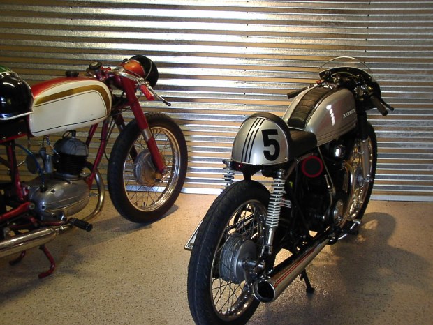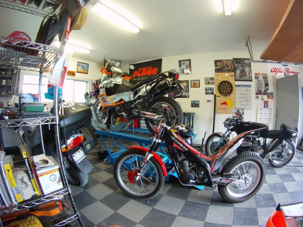 And that is a hell of a nice quiver there. A custom cafe’s Suzuki Titan. A KTM Adventure, A BMW(RS?), and a wicked GasGas trials bike. Hard to get bored with a collection like that.
