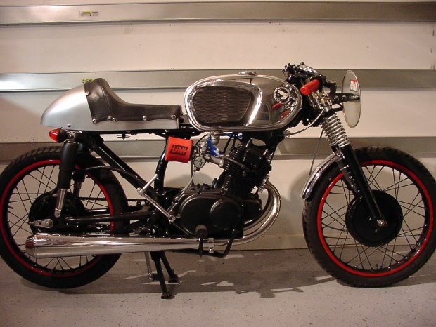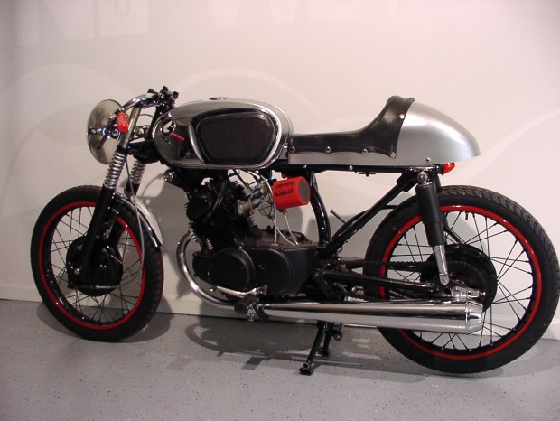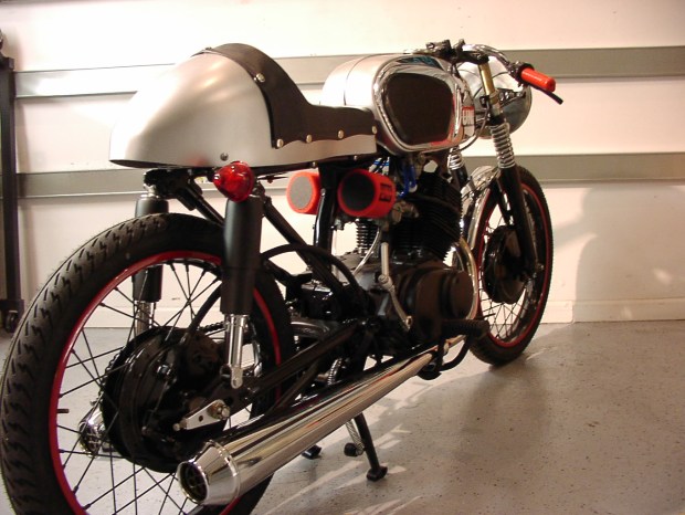 Steve, here are a few pictures I took this morning about a half hour before my client came to pick up his bike. It’s a 1973 Honda CB350F with 5800 original miles on the clocks. It was in pretty rough shape when I started the project back around Christmas of last year, but the end result was worth the wait. Damn near every part on this bike has been touched in some way to make it better. A laundry list of parts were stripped, powder coated and or painted while others were polished or replaced. Rough estimates of weight saved from parts cut off or omitted is about 55lbs. If it wasn’t absolutely necessary to make the bike run, it was removed to save weight. The engine was left basically stock other than the hand made exhaust canister, the Dyna-S ignition and the pod air cleaners. We did bump up the jetting for the increased airflow but that is about it. I know these little bikes can go 100K miles with regular maintenance but any major mods would only hurt the longevity so we stripped her of excess weight instead. Just this morning I stretched her legs and ran up to 105 MPH before shutting her down to take these pictures. Pretty impressive considering I’m 6’2″ and 260lbs. My client is a bit younger, 75 lbs lighter and in much better shape than I am, he should have a ball riding her around the coastal area where he lives.