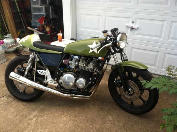 I thought I’d send you these shots of a recently finished project I did for a close friend. Its a 1979 KZ650 that we punched out to a 810cc via Wiseco bigbore 10:1 comp pistons and a KZ750 cylinder. Quite a bit of custom fab was done for the GSXR1000 foot controls to mount as well as the ZX6 swingarm which is about 2″ longer than stock. The seat base is an Airtech designed for a CB750 and it fit right on with minimal cutting There is a 1/8″ alloy under tray that the seat base mounts to and hides all the electrics behind the custom alloy side covers. My buddy proudly served in the 82nd in Desert Storm so the paint scheme was even more fitting. Hope you like it. We’ll do a proper photo shoot this spring after a couple minor bugs are worked out of it.
