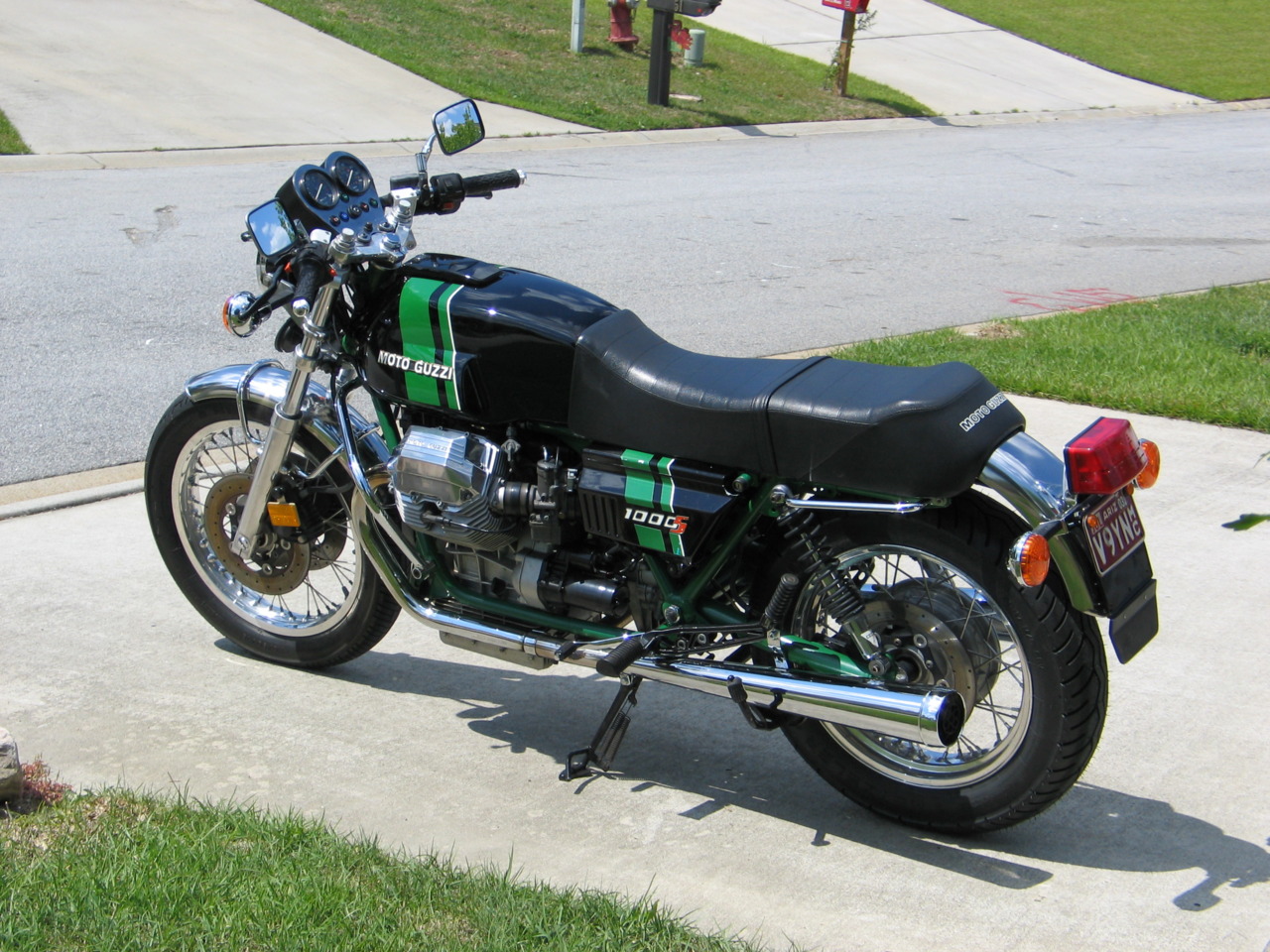 I just don’t get why Guzzi didn’t put a bump-stop (cafe racer) style seat as an option on these late ’70’s sport bikes, but it would sure look better than the sofa they used. I had a ’72 V-7 Sport with drum brakes, and wish I’d never sold it for a Sportster.
