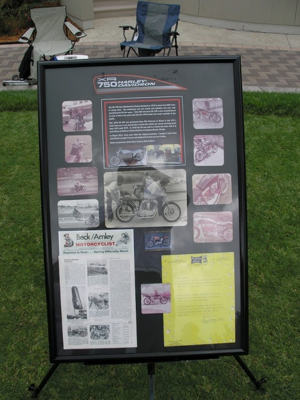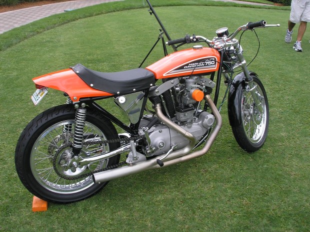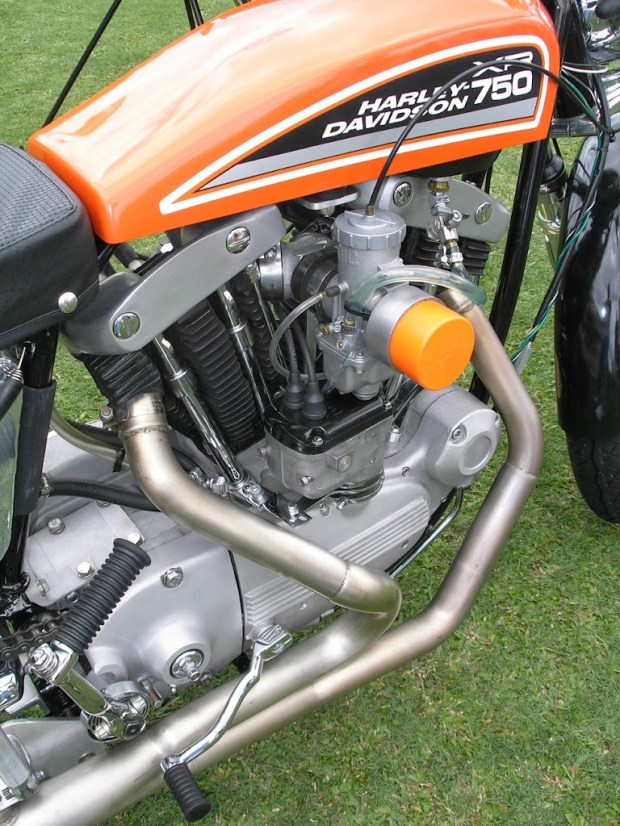 I have no idea why this particular iron XR has mechanical discs, as I wouldn’t use them on anything bigger than a 250. I’d rather have a lightweight 8″ drum, as they work as well as a disc for normal riding, and are lighter. The DLS drum brake on my Guzzi V7 Sport was every bit as good as my Sportster disc. There are no front brakes on real flat track bikes, however. I saw these early XRs run at the San Jose Mile in ’70 or ’71, along with the first 750 kitted BSA A75s, Triumphs, and Nortons, when I was on the coast. Can’t rermember who won that day, though. It WAS the 70’s…
