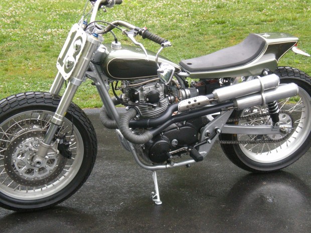 Just completed this one. Custom aluminum tank, custom triple clamps, 03 gsxr forks, rotors calipers and hot wing glass seat pad is custom master cylinder, custom made exhaust, barns style hubs, radian swing arm, stainless steel bars, LED tail light, Piaa eye ball lamps, custom rear brake hanger, sun rims, Buchanan spokes, Maxxis tires, Mikuni carbs, Braille batterie, Progressive shocks. Andrew Elia Solon Ohio