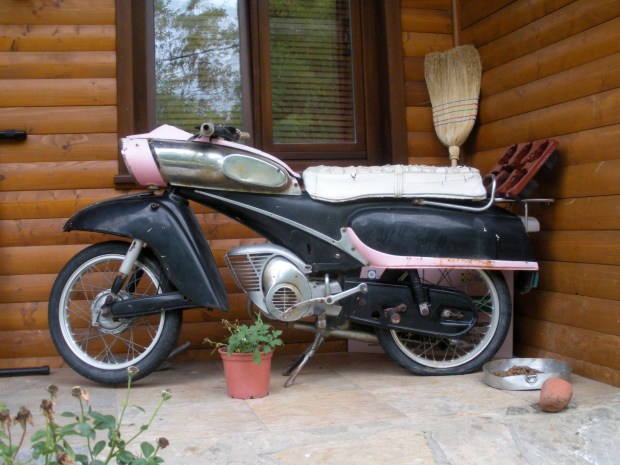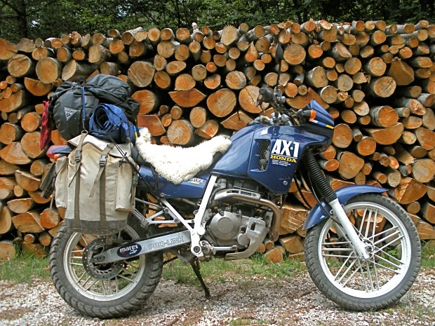 Mystery bike in Paranesti,Thrace, Greece. —also— my ancient [1989?] Honda AX1 250cc while on tour of the Rodolpi Mts, same area.
