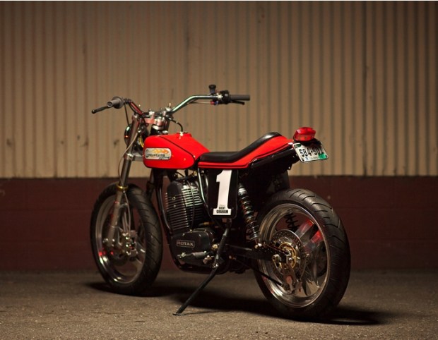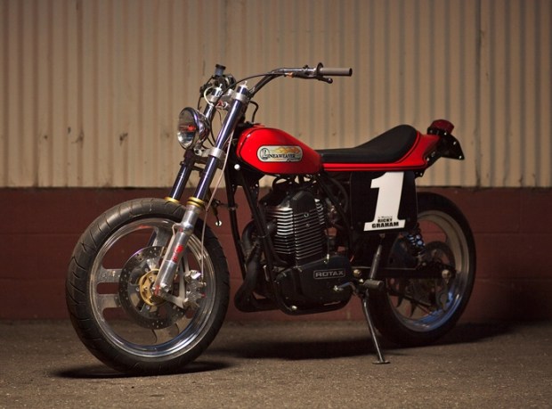 “Offered for sale is a one of a kind Lineaweaver Racing assembled Rotax powered flat-tracker. This bike was custom built as a tribute to Ricky Graham. Ricky was AMA Grand National Champion three times: in 1982, 1984 and 1993 earning him AMA Athlete of the year in 1993. The bike was assembled during the 1991-92 calendar year. Andy Mill, the world-renowned World Cup downhill skier and, commissioned the assembly of the bike and was the first owner. Andy put nearly all of the bike’s current miles on it, totaling less than an estimated 20 hours. Being a race-modeled bike, no odometer exists.