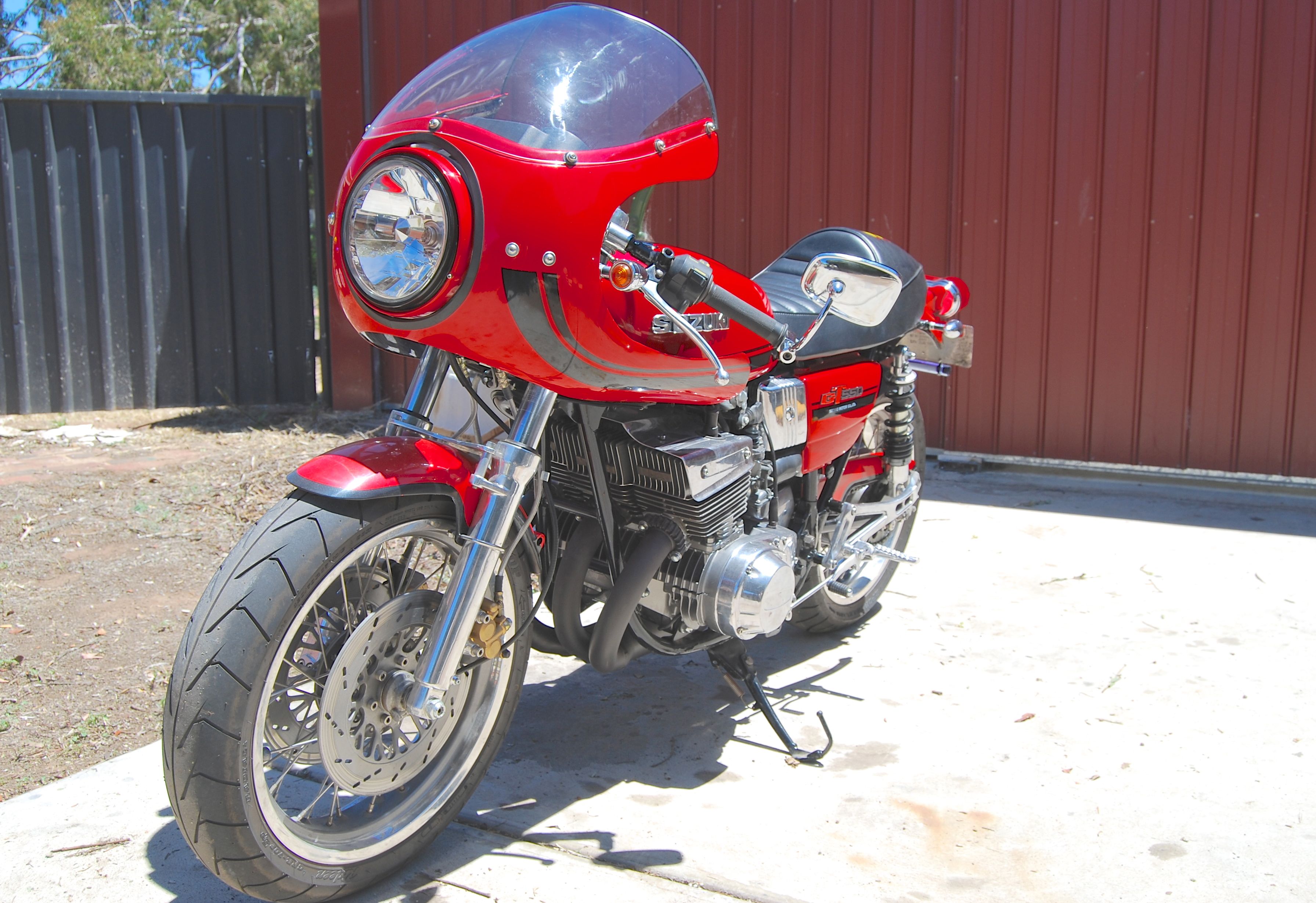 2. Hey Sean,just saw the 1976 gt550.Nice bike.Heres the build I did to mine.75 gt 550 ram air.GSXR front forks.SV rear swingarm.kawasaki 636 rearshock.hayabusa rearsets.norton headlight.lots of powdercoating and love put this together.I’ve had this bike since it was brand new.