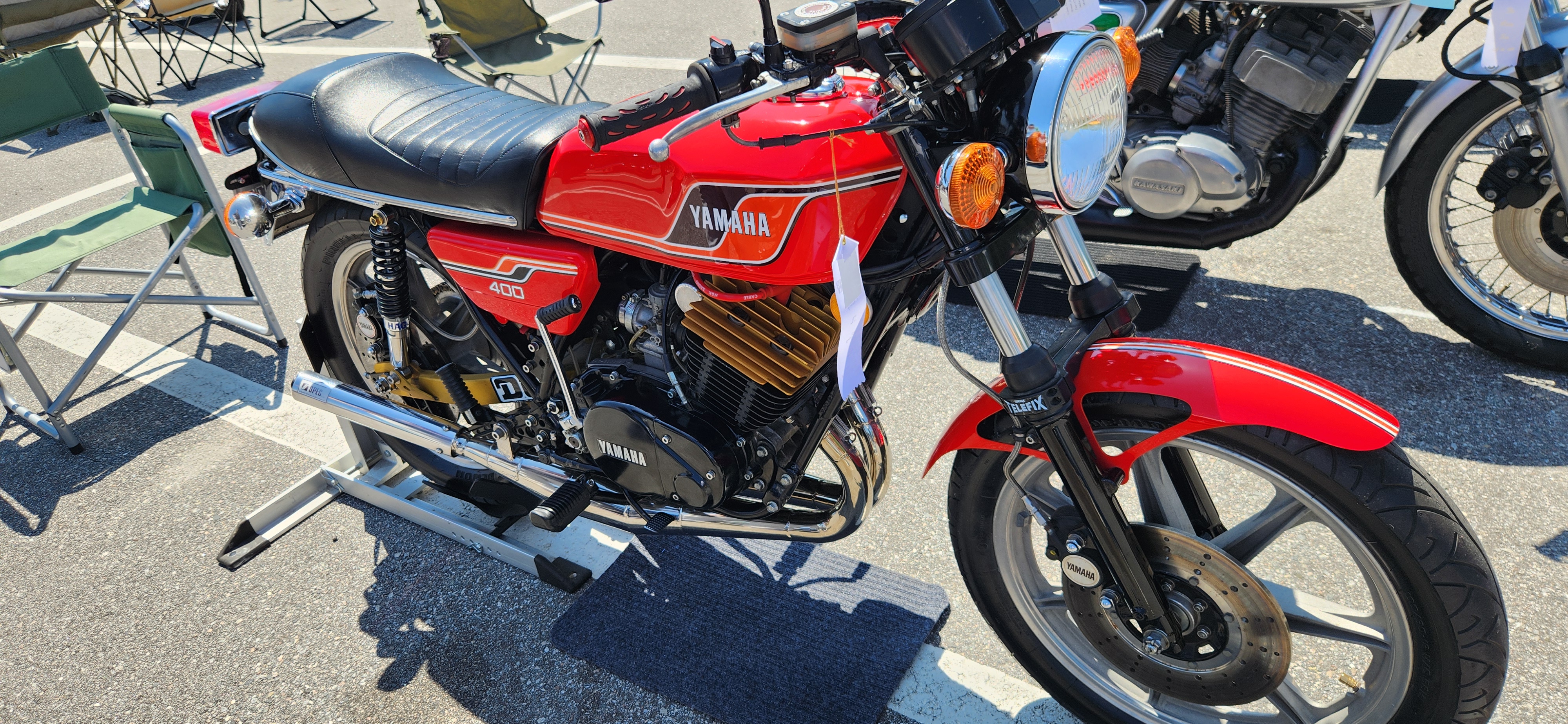 A very nice Yamaha R5 from last years local show. From my “Riding Into History” archives. If I could drop 40 pounds something like this would probably be my daily rider. Love the radial heads. Share: Click to share on Facebook (Opens in new window) Facebook Click to share on X (Opens in new window) X Click to email a link to a friend (Opens in new window) Email Click to share on Reddit (Opens in new window) Reddit Click to share on Pinterest (Opens in new window) Pinterest More Click to print (Opens in new window) Print Like Loading...