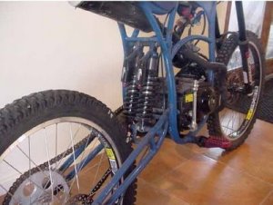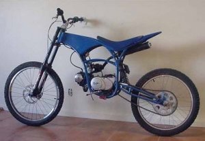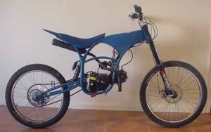 Anyway if nothing else you will get good laugh out of them. The “99bike” is my answer to a powered mountain bike. I tried for under 100lbs but came out 103lbs. It is the size dimensionally as a full size dirt bike but much narrower. It is 125cc with 8″ front and rear suspension travel. I built this one from scratch, inlcluding the rear hub so i could spoke a 24″ mountain bike rim to it. Front is a 26″ DH bike wheel. I have taken this on our local mountain bike trails for almost a year and beat the hell out of it and have not broken it yet. The appealing part of the crf50 type engine is the auto-clutch. I can climb a steep hill and stop at any point without clutching or stalling. It is geared very low and you can pull a wheelie at almost a stand still. Top speed is about 40. I get really strange looks on the trails but its a blast to ride, quiet to not disturb anyone and gets killer gas mileage.