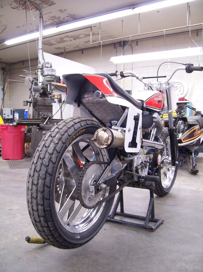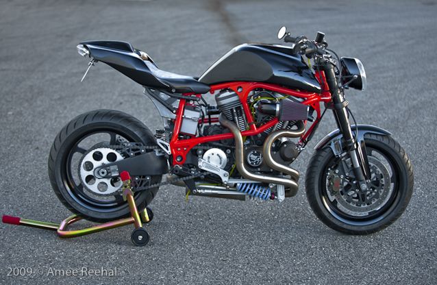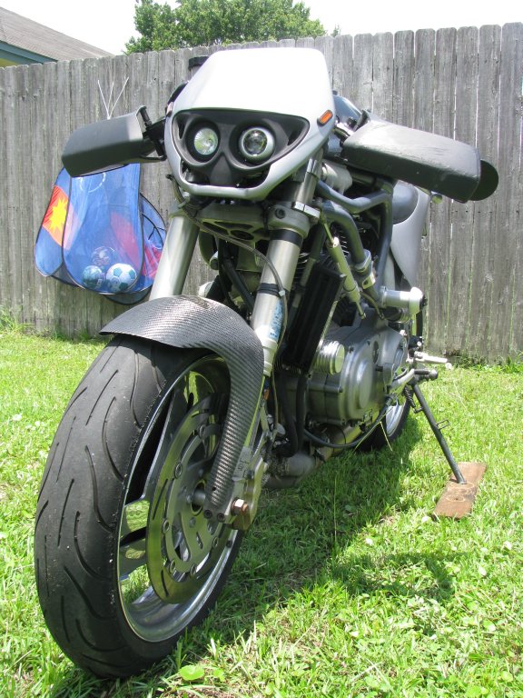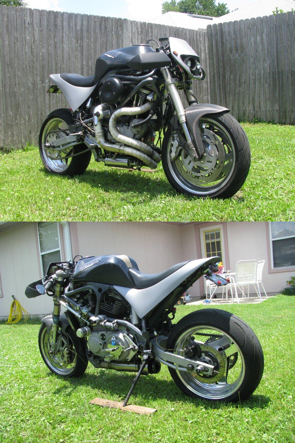 He Writes: Here are some pictures of a buell that i built for my wife Ann. a bit of Ducati but more Buell = Bucati???? At break in, we had 100 bhp + 100 ftlb torque with another 1000 rpm to go and power / torque still climbing. That was with the PSI series III 48 ( which actually measures 57mm across the throat ) lectron style carb. having some trouble with the adjustment we opted to go to a mikuni HSR 48 flat slide which actually dropped power by 3% but adjustability seems much easier / user friendly than the PSI. Enjoy!