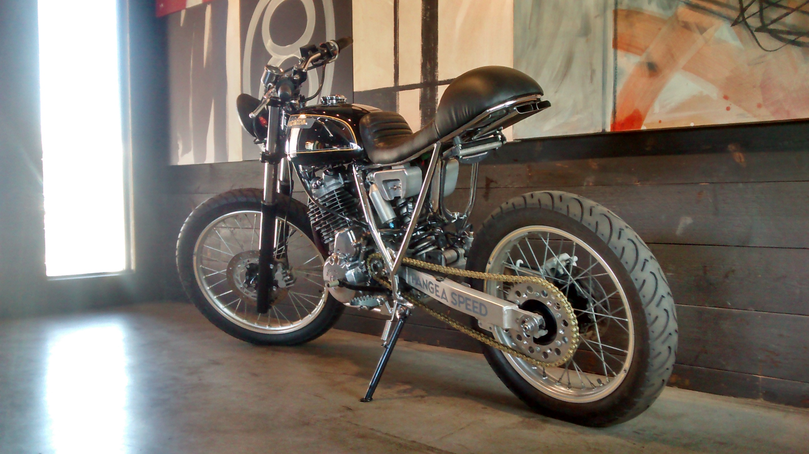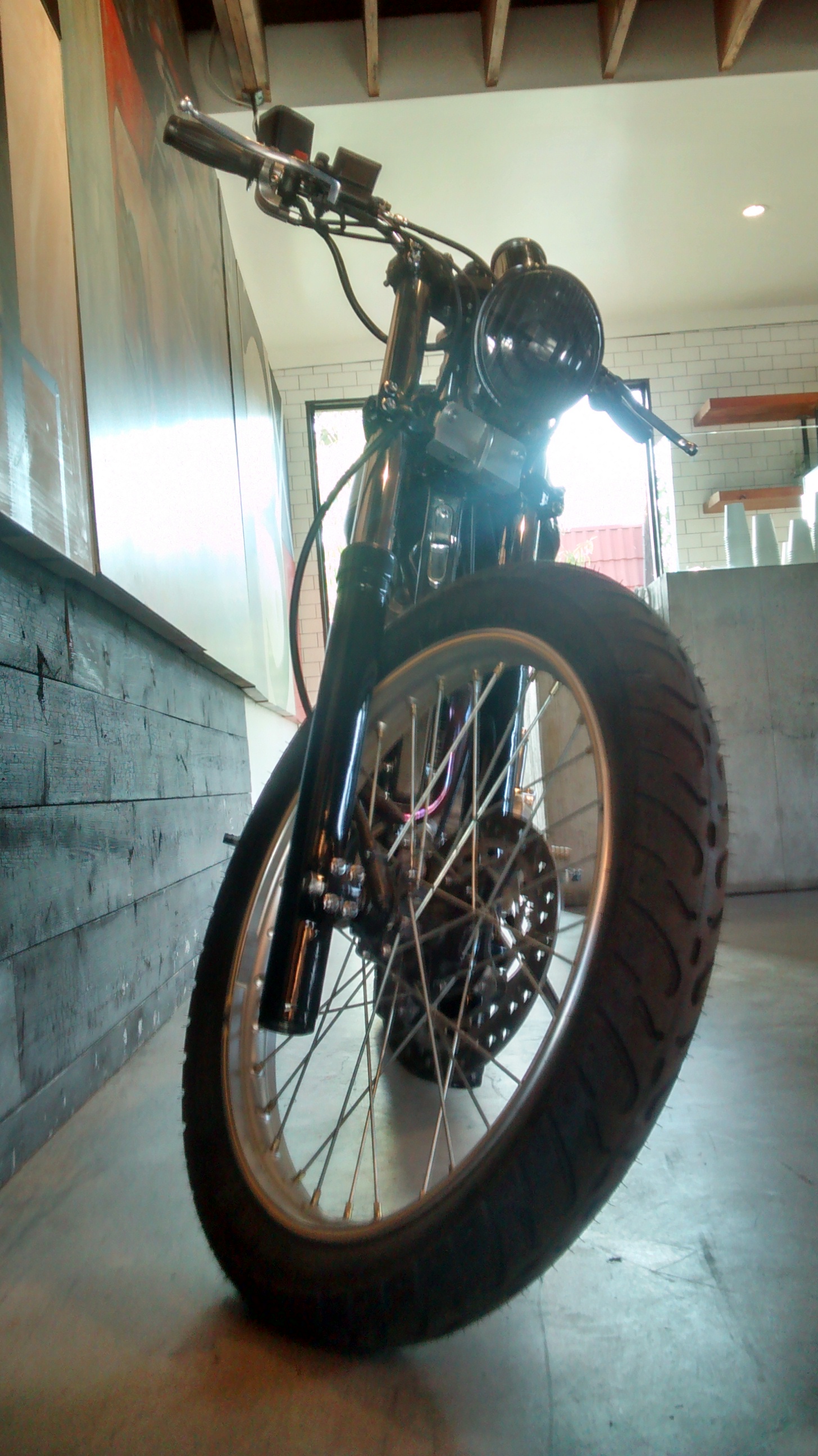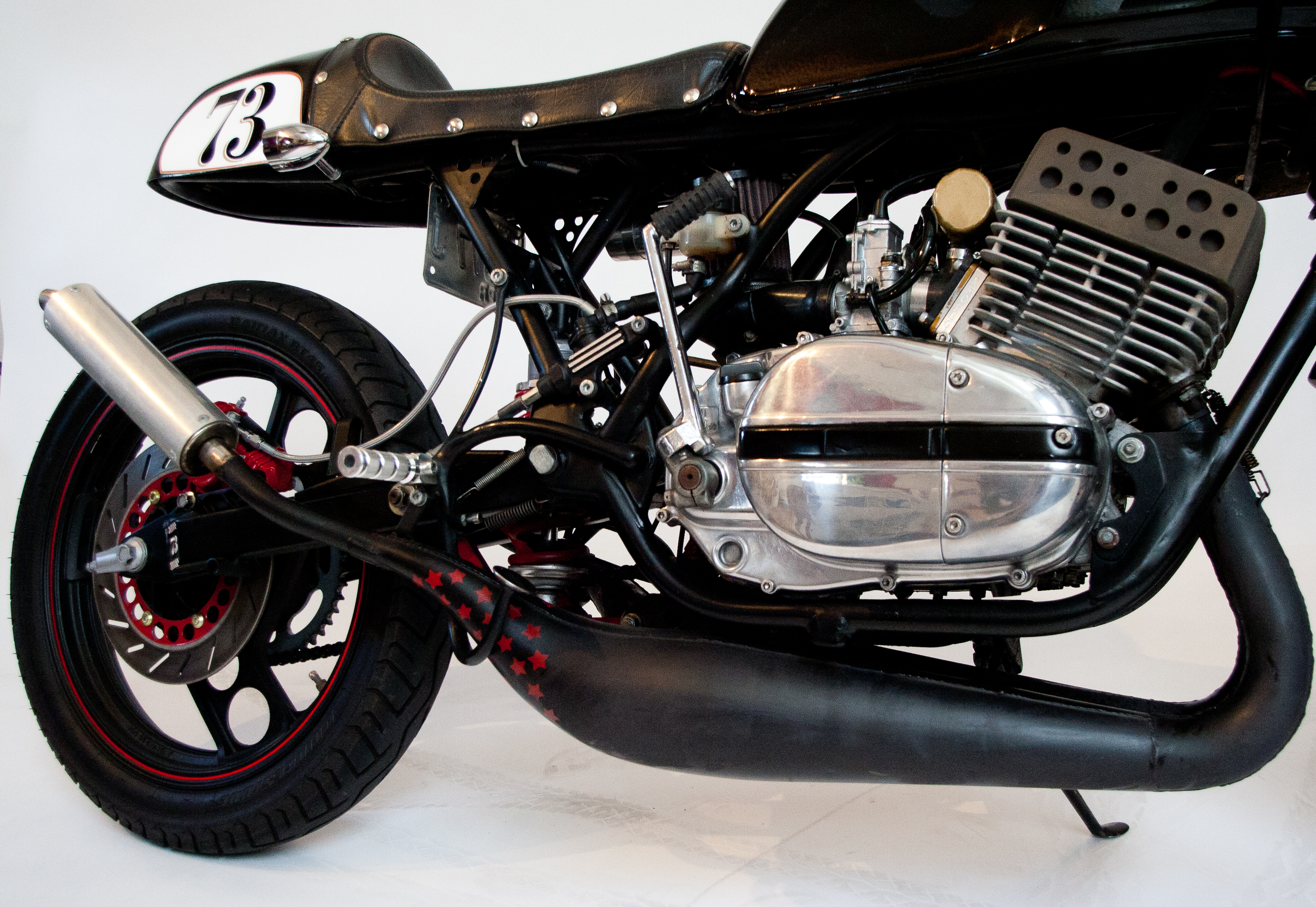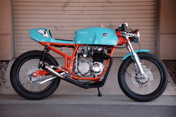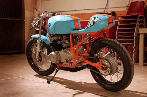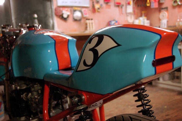 So I bought the original bike a 1975 Honda CB550K in October of 2010, which was stock except for the exhaust. With the exception of the engine, which was in great shape, everything on the bike was replaced, refurbished or built anew. The subframe was built to match up to the tail, which was built to echo the tank. Both tank and seat/tail are constructed from a mix of fiberglass and Kevlar. That was an eye-opener for me; due to Kevlar’s uncooperative nature, I have to say the next build will exclude it entirely! All of the 36 year old bearings and bushings were replaced for peace of mind. Many members of the forum Do The Ton contributed to this build whether by encouragement or hooking me up with parts. For instance, the rear sets and top triple clamp were machined by a forum member, and the logos were airbrushed on by a friend and fellow forum member, with the stencils being made by another! The paint scheme and name are in honor of Gulf Racing’s efforts at the 1975 24 Hours of Le Mans race.