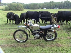 The first picture (with the cows) was taken the day I brought the bike home. That’s exactly as I bought it. Since then, I’ve cleaned it up a bit more, shot some correct-paint on the engine’s sidecovers, and did same for the pegs and rear brake pedal. I also resprayed the air cleaner cover and installed a repop “Wombat” sticker on it, plus blasted the pipe and shot it with high-temp, correct-satin paint. Also installed new petcocks and repop grips. Plenty of parts of available for these little Hodads, and the rider following is cult-level.