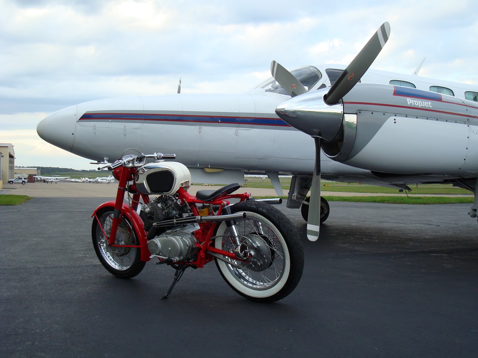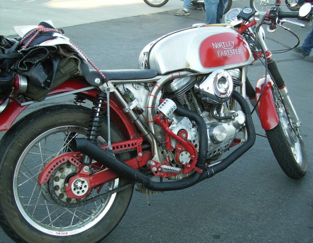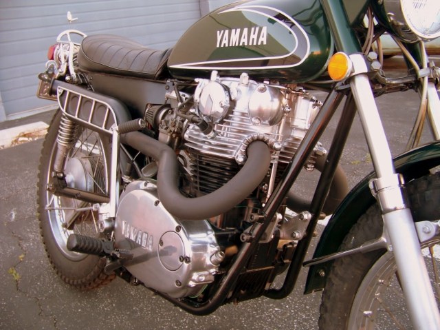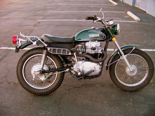 Hi great blog you have going here! Here are some pics of a bike my friend Sabrina just finished! It started out as a Craigslist found ct1 175 enduro with a knackered engine, so we replaced it with a fresh 650 unit, which Sabrina built with some pointing and grunting from me. The frame took some serious modifications to get the engine in there. I did the exhaust, mufflers and the frame work and helped find the parts. Next up is a big twin leading shoe drum from an R5 and some fork boots. All the best, Mike Cook