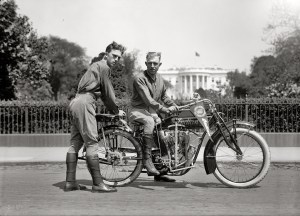 1915. “Baker and O’Brien, transcontinental motorcyclists, back of White House.” Bud Baker and Dick O’Brien, whom we first met here. In May 1915 they embarked on a five-month, 10,000-mile overland jaunt to the West Coast via Indian motorcycle to see the California expositions. Harris & Ewing.