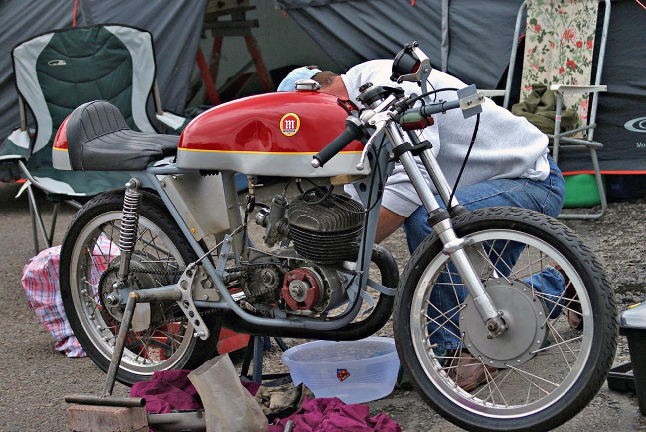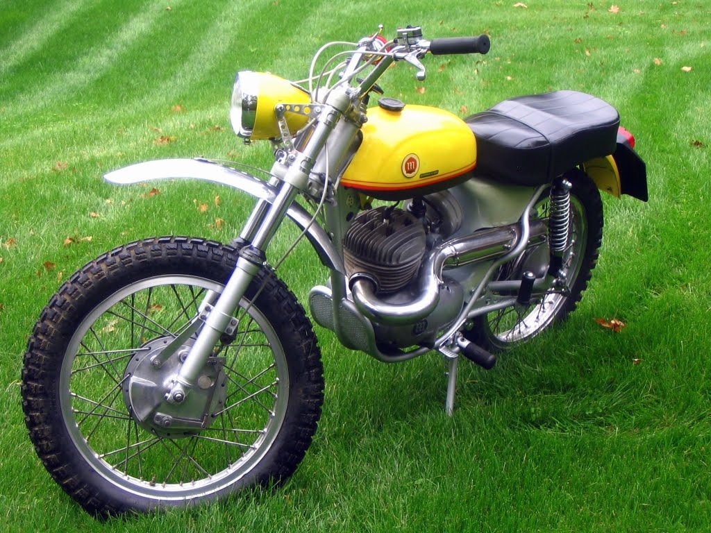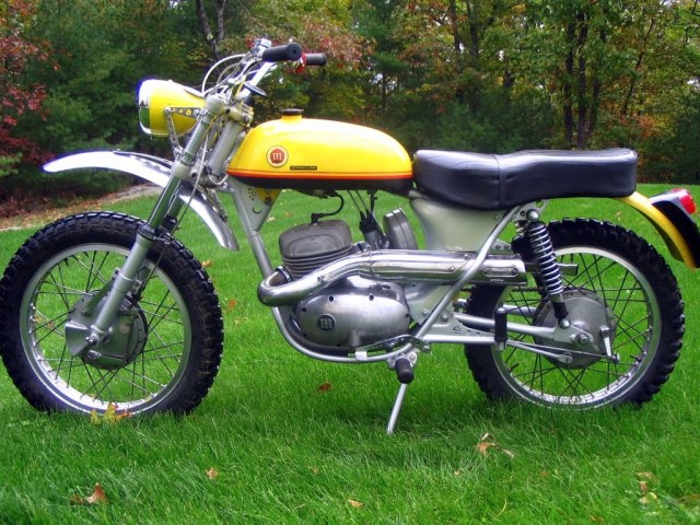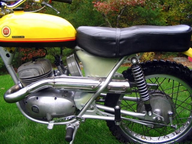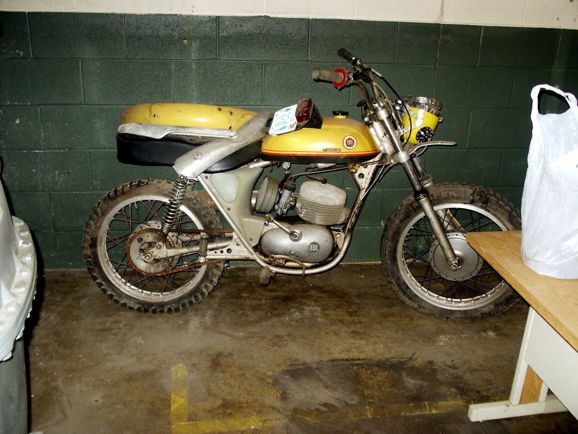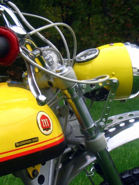 I found this Montesa on Craigslist in the Summer of 2006 – it’s a Scorpion 250, probably sold in 1968 or 1969. Looked pretty rough in the pic the seller sent to me – see below – so my original thought was that I’d part it out on eBay. I knew the front wheel alone was worth a few hundred bucks (more than I paid for the bike). It’s a sought-after twin-leading shoe drum with air scoop that was also used on the Montesa Impala (street bike) and LaCross (real motocrosser). But once I saw that the bike was nearly complete, I figured I’d see what it took to get running. So cleaned it up, painted the frame, straightened the front fender (yes, that’s it on the seat in the “before” pic), fabbed a seat strap, added a new chain, OEM rear brake pedal and shift lever, kickstart spring, rear brake light switch, taillight bracket, handlebars, points, condensor and plug. That’s about it. The rest was original — paint on tank, fender and headlight, grips, levers for the clutch, front brake and choke, even the footpeg rubbers, tires and that funky red leather thumb guard on the throttle.