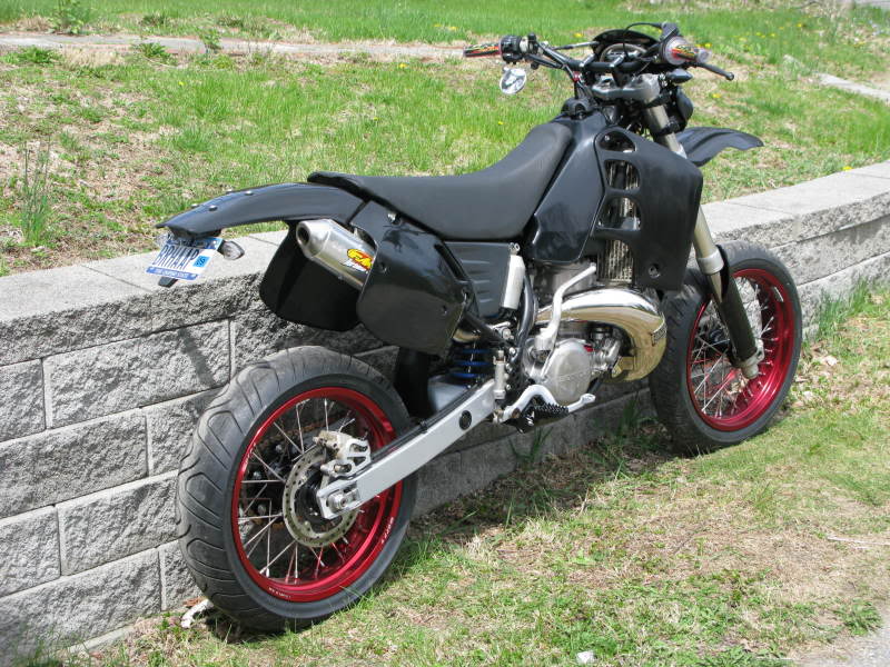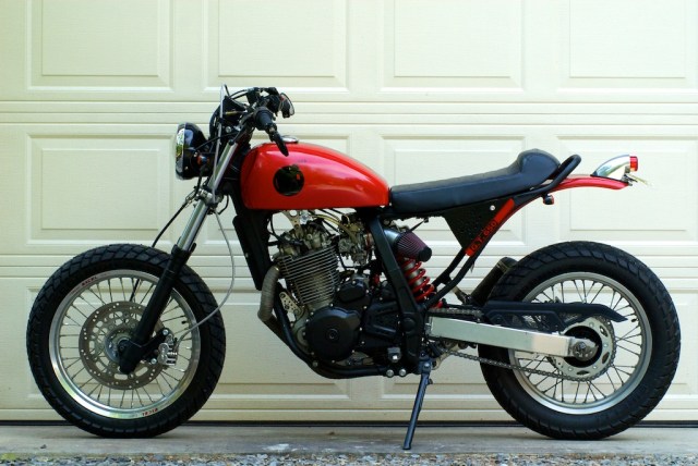 Thanks for your comments.Like you said great handling bike just cluttered and a little ugly.The rear rim is a stock 17″ the front I changed to 18″ it balanced the profile and lowered it an inch.The front and rear suspension were lowered 3″ and still has 7″ of travel.I cut about 12″ off the back frame and welded a new hoop.Seat pan is stock with new foam.The tank is off an old Harley and mounted like the factory. The exhaust, side panels and head light bracket are all one off made by me.The oil cooler I remounted off the front of the frame.All the old tabs were cut and ground off to clean up the frame.The stance of the bike came out perfect and I can still lower it an inch front or rear. The motor is stock except for the pipe,jet kit and K&N filter.Tires are Scorpion A/Ts.The bike is for sale so I can start a new project over the winter.