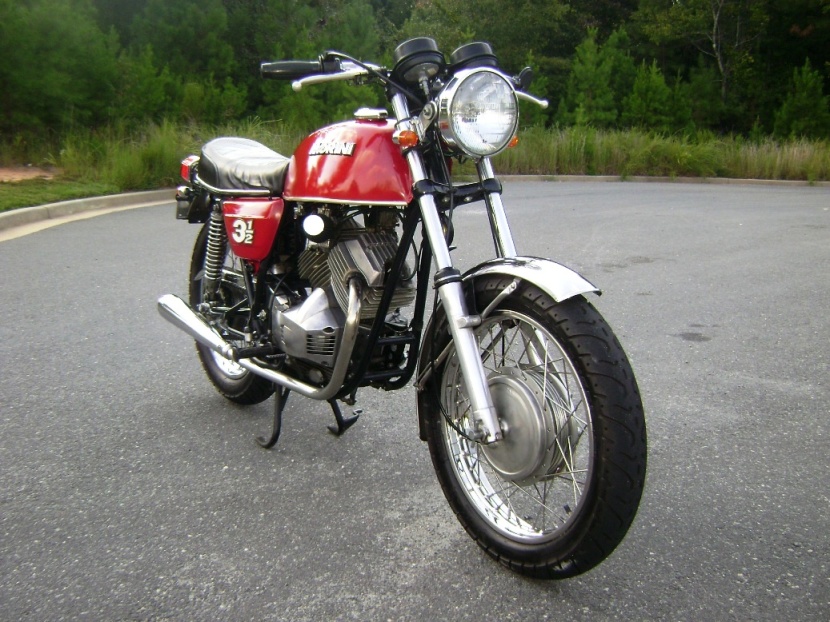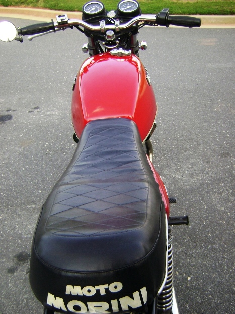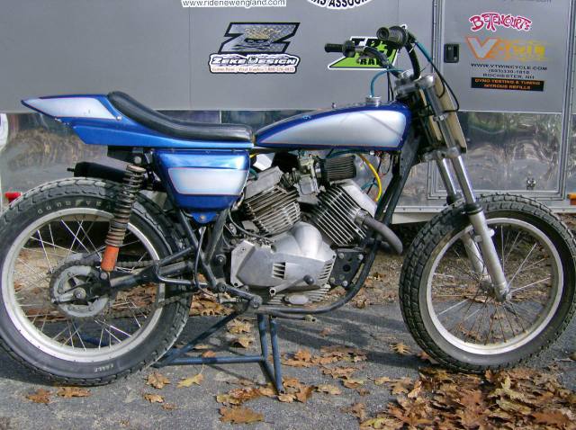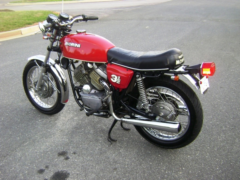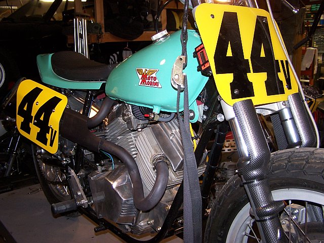 By way of description, it is a 1978 500 Morini with 19” dirttrack wheels and Grimeca brakes that I use to run in the “Vintage 500 Pushrod” class in AMA District 36 dirttrack events. The motor is stock internally with slightly bored carbs. What really makes the motor sing are the pipes, the 72 degree V angle of the motor usually makes the front pipe much longer than the rear pipe, because I’m not using a battery and it’s a race bike where a little exhaust heat isn’t a problem, I snaked the rear pipe through the frame and the pipes ended up with 1/16” difference in length. The motor revs easily to 12K RPM and has seen 13K twice when I mis-shifted. I’m using standard 35mm Ceriani forks with Cartridge Emulators and a careful revalve/respringing, the shocks are adjustable YSS units that work very well indeed. The bike is the most powerful in its class by a fair margin but because I’m so big (6’1”, 270 lbs), I’ve only been able to earn a #2 plate my first year and a #3 plate my second year. Best of all- it makes a bitchin’ noise at 12K!
