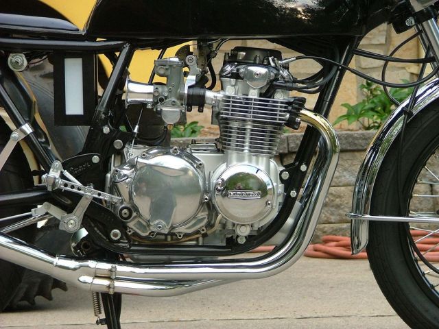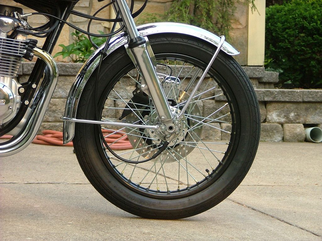 New Footpeg rubber, seat, front fork boots, as well as grips were aquired and installed. New tapered roller bearings on the steering stem, progressive springs and new progresive shocks and bronze swingarm bushings renewed the suspension and worked much better than the stock componets. For tires we found a set of new K-70 dunlops for that retro look.