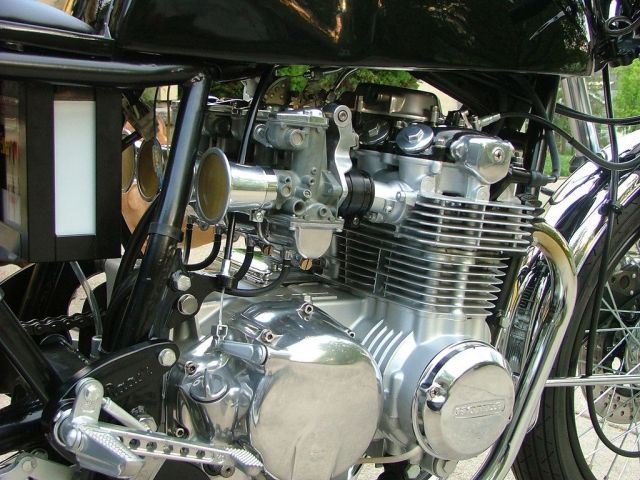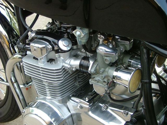 Carbs were also stripped and painted, bodies satin black, covers & bowls hi-gloss black and rejetted for the chambers and K&N pod style air filters instead of the stock airbox. All cables, hoses & fuel lines were replaced with new.