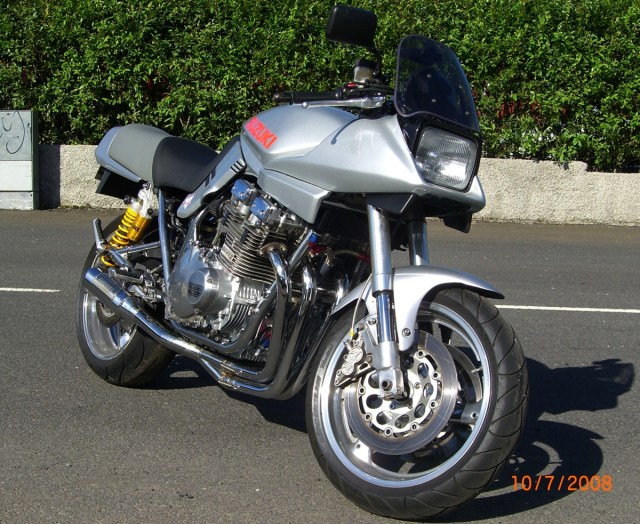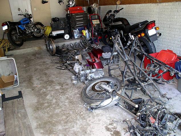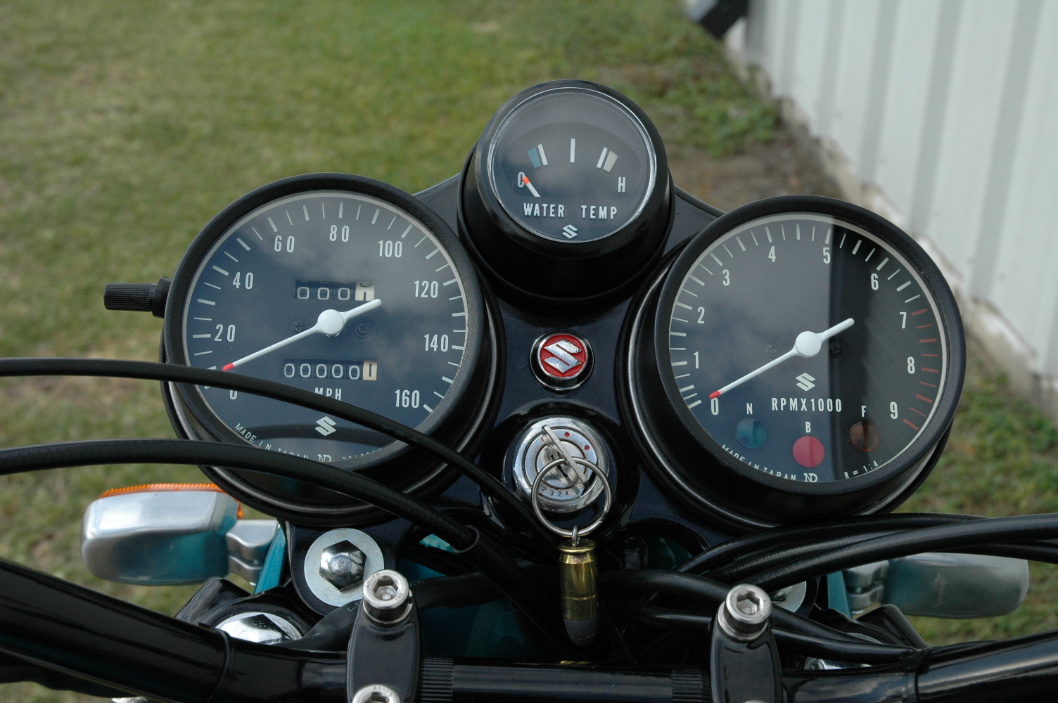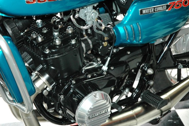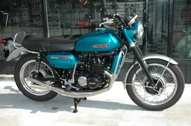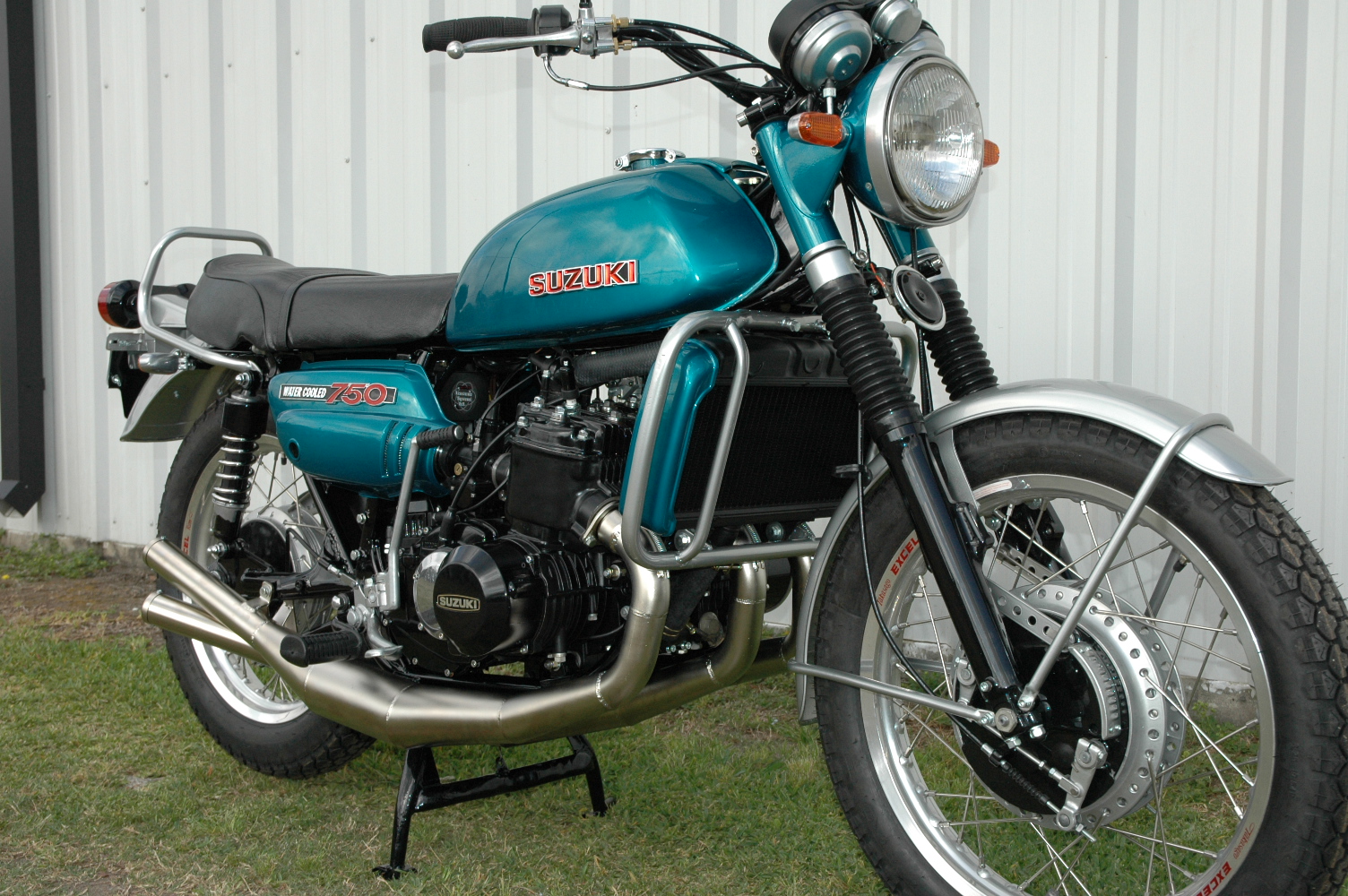 Here is a custom restoration we did on a ’72 Suzuki GT750. The bike came in to us all apart in boxes and had been that way for several years. Actually there were two frames and parts from two different bikes, a ’72 and a ’73.