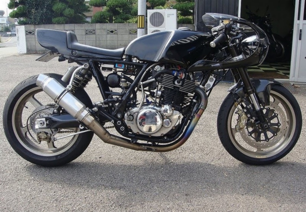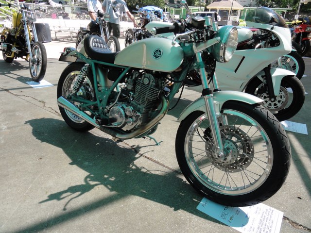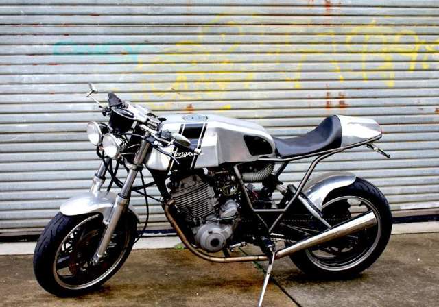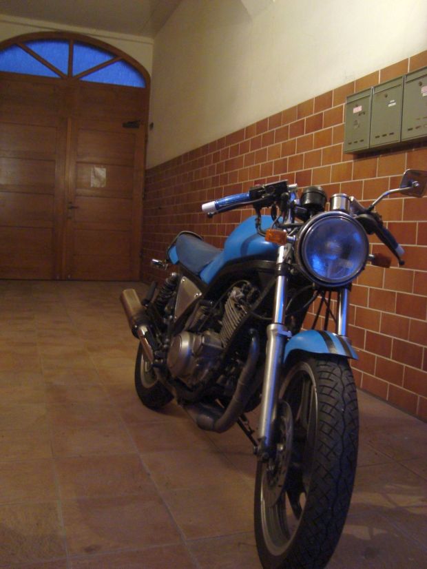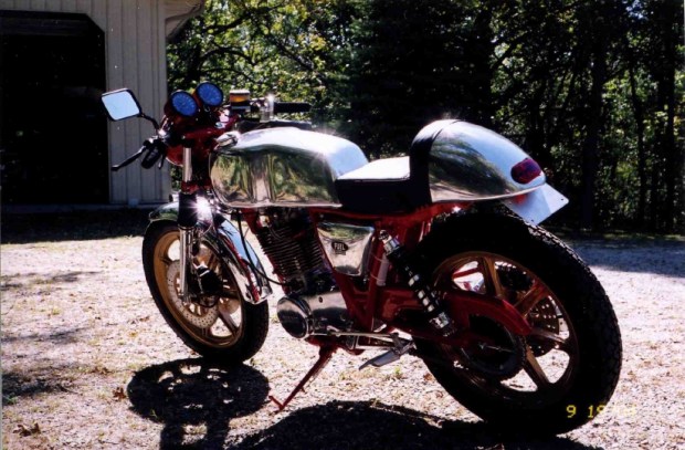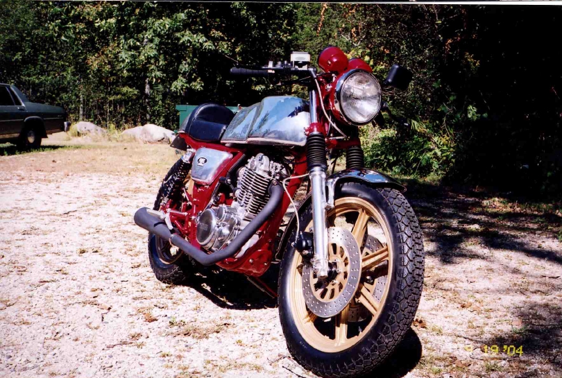 In it`s most recent incarnation, it went from flat black cafe racer to sky blue, little flakey roadster; see attachment.