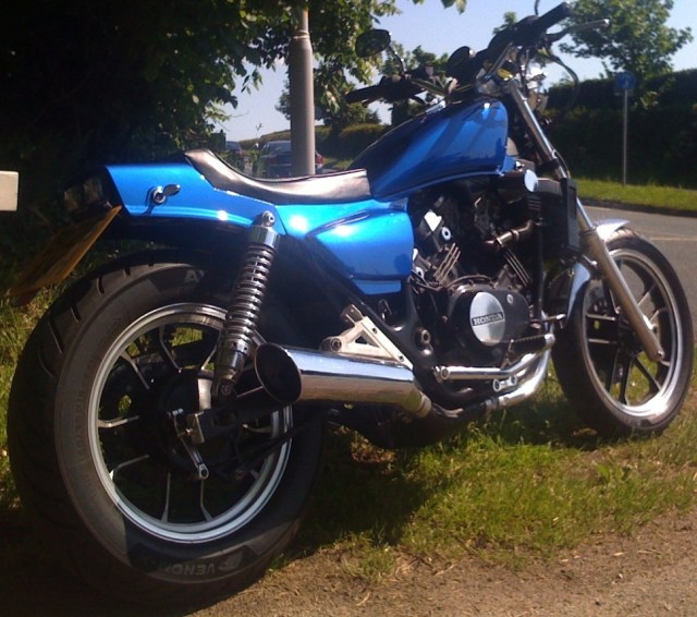 I want to show a personal project I recently completed. It is a Honda CM400T, base uncommon, has been done by me and some friends. I do not define his style, bobber, track, brat … is a modest project but I’m very happy with the result. Major changes are, handlebars, handlebar switch, repositioning of the electrical components and battery box, exhaust, rear set, clocks, modified original seat and paint job. Appear on your blog would be a reward for my work. I hope you like.