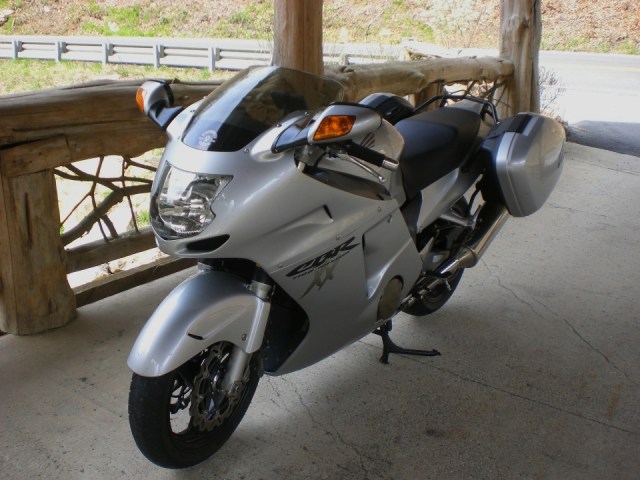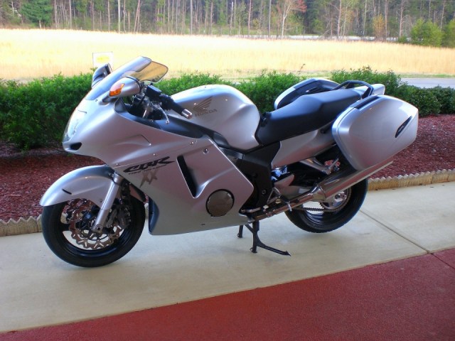 It is a CBR1100XX that I sport tour on, purchased for my 45th birthday. I have upgraded the suspension with Race Tech fork mods, a custom built Penske shock, Braking Wave Rotors and DP HH pads. Other mods for long distance are VTEC VFR handle bars, Grip Puppies, and the rare (in the US) factory panniers available in Europe and Australia. The bike also has Speigler braided SS brake lines and GPS. I also installed Canadian market Super Blackbird decals.
