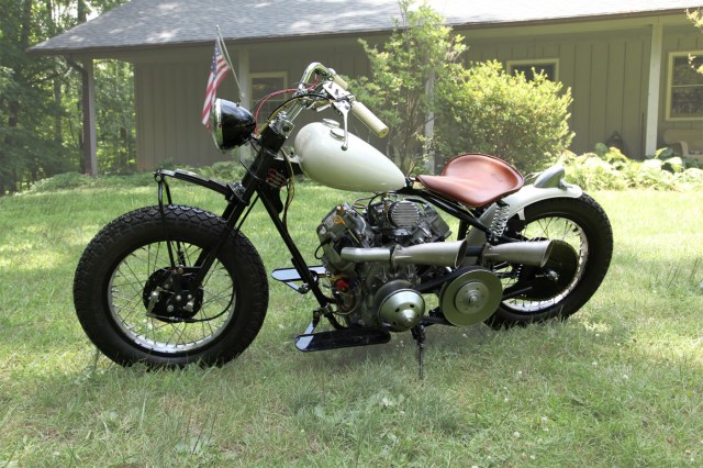 Bob Decker sent in some pics and links to this really cool custom Briggs and Stratton powered custom but this is the only one I could get to that was big enought to use. I’ll update the post if Bob can get me some more. I love this concept. I’ve looked at the big Briggs engines and before and thought that they were plenty powerful enough for a motorcycle. 35 HP and 52 ft lb of torque ain’t bad! Guess I was right! Thanks Bob!