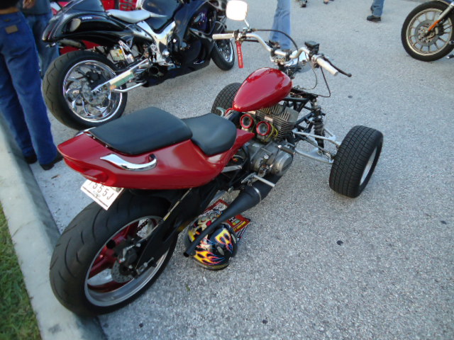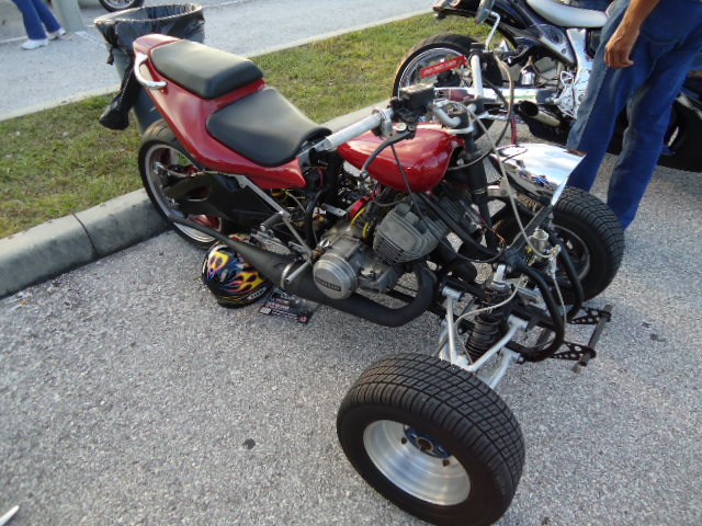 From the “things you don’t see every day” department. A Kawasaki 2-stroke reverse trike.