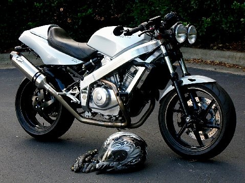 Started out with a 1973 Yamaha RD350 we move the swingarm pivot points back about three inches and put a RZ rear end on swingarm disk brakes and a after market Fox race shock mono shock. We went from a 73 twin shock to a modified RZ race rear end with a 6 and 1/2 inch stretch to the rear end. Vintage Avon front clip modified RD400 tank and a vintage Ducati tail section