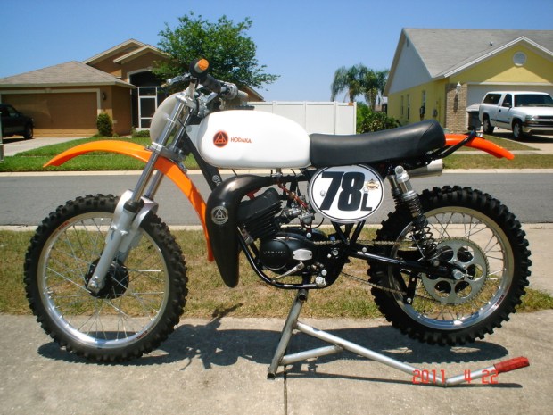 1974 Hodaka Super Rat Model 98. This bike won the 100cc Florida Vintage Motocross Series in 2011. It has a PVL ignition, Harry Taylor Gen3 Up-Pipe, Ohlins rear shocks, front end is from a Thunderdog 250, 1″ extended swingarm, Excel rims and much more. If you want a bike to win the 100cc class this is it.