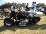 Don Christy makes “cycle art” from junk parts and bicycle frames. Everything is miss-matched. On one piece the v-twin’s cylinders are made from plastic drain pipe. The crankcases on many are made from cake pans. Very creative. More pics are at www.flickr.com/photos/boanerges-indy
