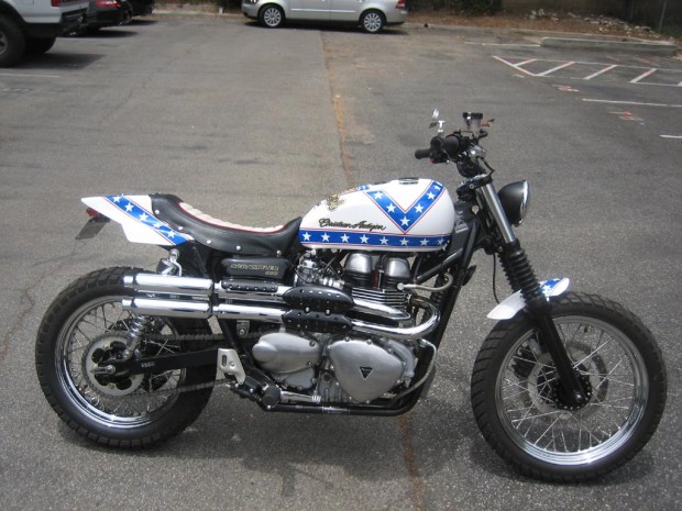 In honor of the British and American contributions to the Fourth of July celebration I found this sweet Evel Knievel Themed Triumph Scrambler over on Yoshi’s Garage (which has some outstanding collections by the way so do yourself a a favor and go check them out).